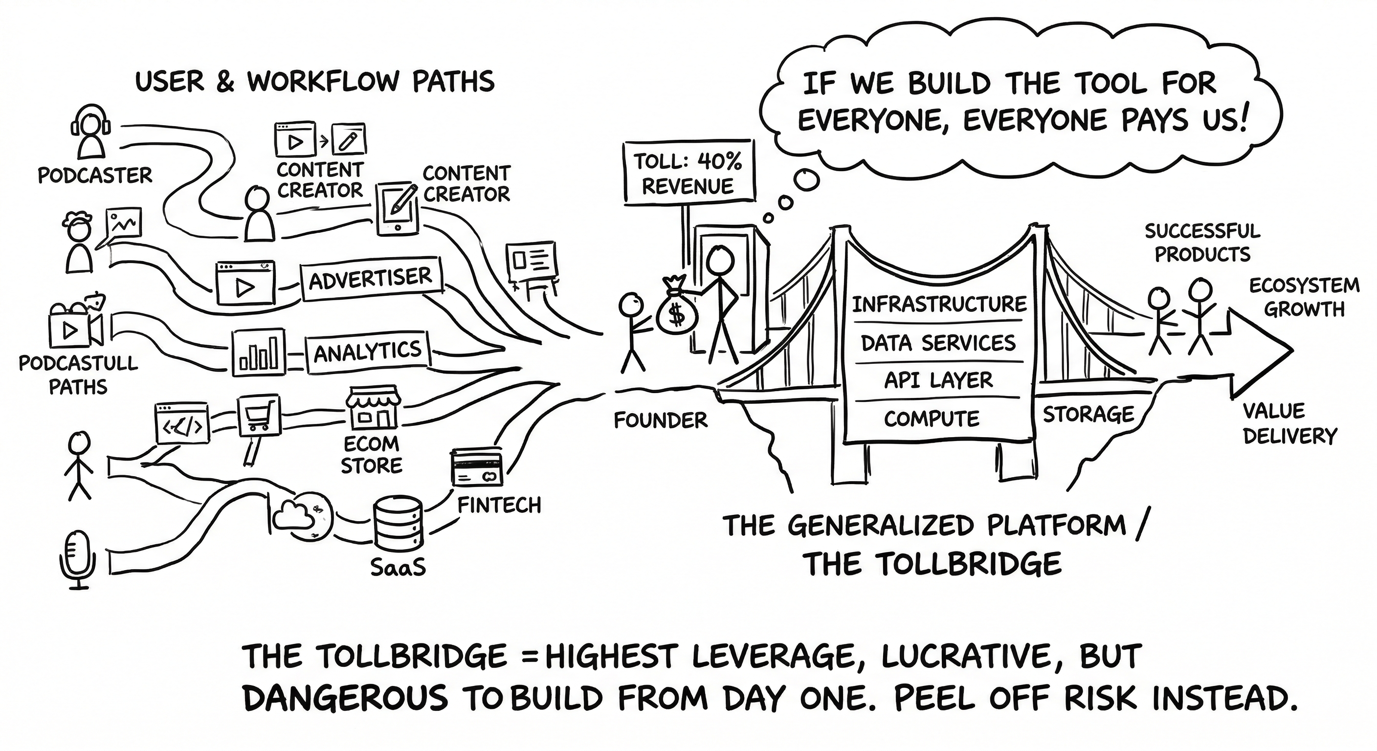Eventually, the founder realizes the most abstract tier of software (the platform or network level) is the highest-leverage, most lucrative tollbridge in the ecosystem.