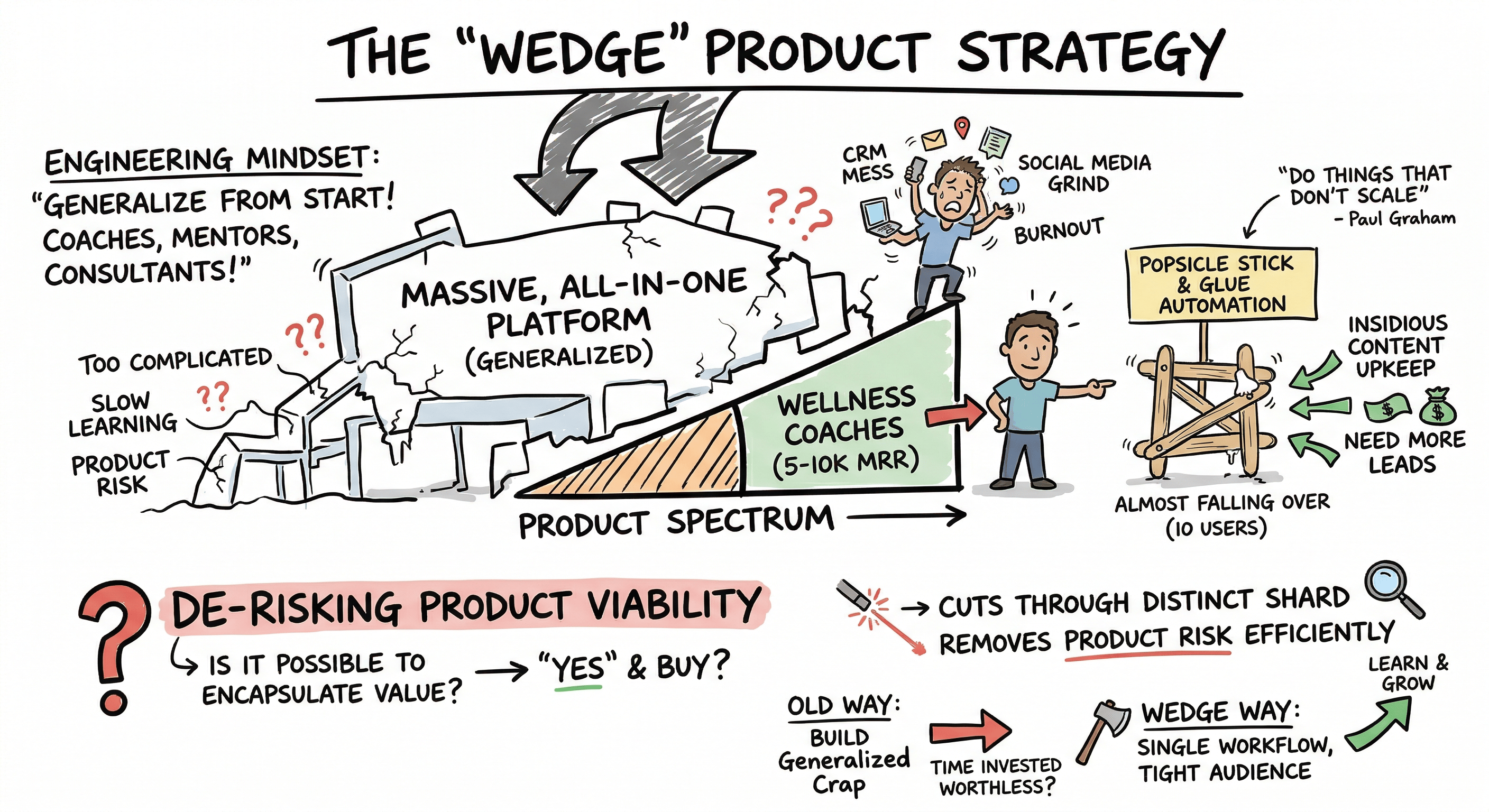 Instead of building a massive, all-in-one podcasting platform, you build a highly targeted long-form content lead-gen tool exclusively for wellness coaches between 5-10K MRR and plateaued and dying for some help to get them to the next level.