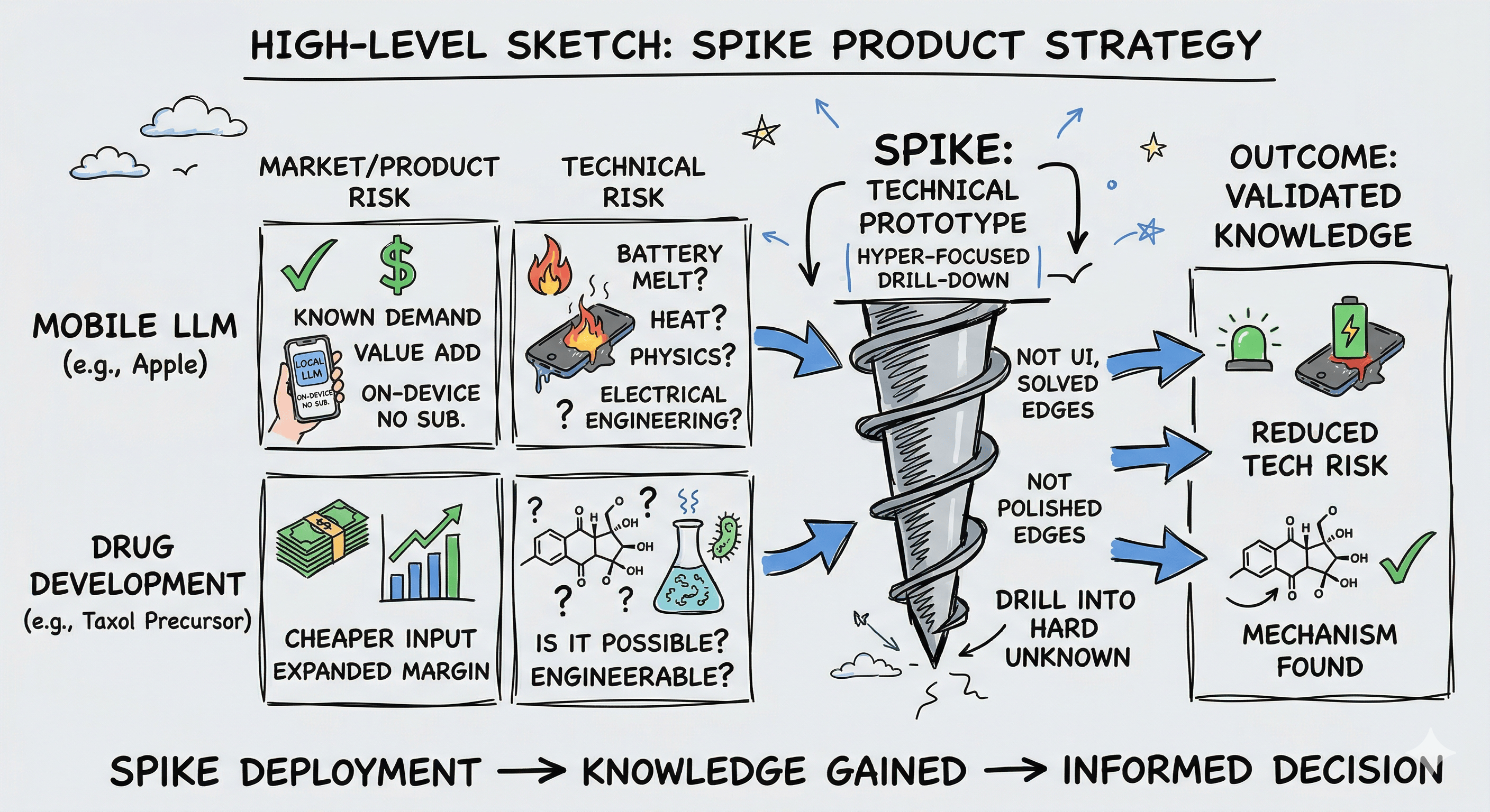 Technical | Is this physically/technically possible? | Spike | Build a UI-less proof of concept to test the foundational constraint. |